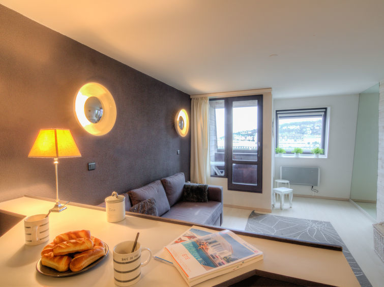 Studio 1-kamer 25 m2 op de 5e verdieping, op het oosten gelegen. Modern ingericht: hal met 1 x 2 stapelbedden (80 cm, lengte 180 cm). Woon-/eetkamer met 1 2-pers divanbed (1 x 140 cm, lengte 190 cm), TV (Flatscreen TV), DVD. Uitgang naar het balkon. Kookhoek (afwasmachine, 2 keramische glas kookplaten, broodrooster, waterkoker, elektrische koffiemachine, combimagnetron). Bad/WC. Elektrische verwarming. Klein balkon 2 m2. Balkonmeubilair. Mooi uitzicht op zee en de plaats. Ter beschikking: Internet (Internet (WiFi), gratis). Rookmelders. 14220 000121 J6
