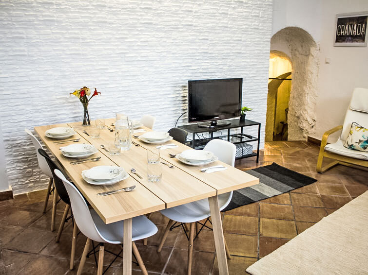 De grotwoningen zijn zeer typische en unieke accommodaties in Granada. Gelegen in de historische wijk Sacromonte (UNESCO-erfgoed), hebben ze een prachtig uitzicht op het Alhambra en de tuinen. Hun architectuur staat er ook om bekend dat zij zowel tegen de hitte van de intense zomers als tegen de winterkou afkomstig van de Sierra Nevada (de nabijgelegen berg) isoleren. Moderne, mooi, zeer comfortabele eengezinswoning "Cueva de Lindaraja", van 2 verdiepingen in 2018. In de wijk Sacromonte, rustige, zonnige ligging, perfecte locatie: in het centrum en toch rustig gelegen. Voor alleengebruik: terras, tuinmeubelen. Trappenweg (20 treden) naar het huis. Levensmiddelenwinkel 500 m, restaurant 500 m, bar 100 m, bushalte "Albayzín - Granada Centro" 50 m. Attracties in de buurt: La Alhambra 2 km, Catedral de Granada 1 km. Auto wordt niet aangeraden.