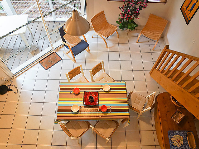 Huis in een rij 4-kamers 70 m2 op 2 verdiepingen. Comfortabel ingericht: woon-/eetkamer met open haard en Flatscreen TV. 1 kamer met 1 2-pers bed. Groot kookhoek (4-pits kookplaat, oven, afwasmachine, 4 keramische glas kookplaten, elektrische koffiemachine). Douche/WC. Bovenverdieping: 1 kamer met 1 uitschuifbaar bed (2 pers.). 1 kamer met 1 2-pers bed. Bad/WC. Elektrische verwarming, air-conditioning. Terras, op het westen gelegen, zithoek in de tuin. Terrasmeubelen, ligstoelen. Ter beschikking: wasmachine, strijkijzer. Internet (WiFi, gratis). Parkeerplaats nr. 18 (2 Auto's). Niet rokers woning. Maximaal 1 huisdier/hond toegestaan. Rookmelders.