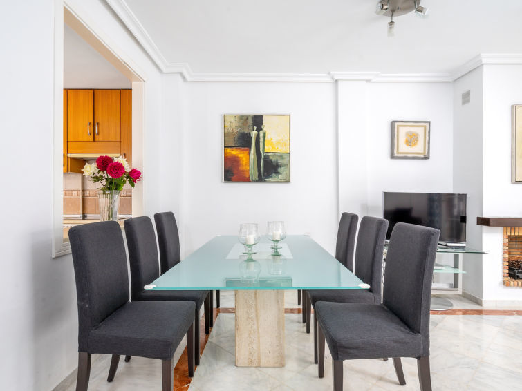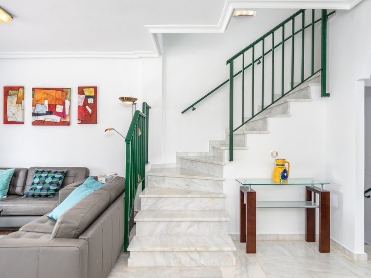 Huis in een rij 4-kamers 157 m2 op 2 verdiepingen. Gedeeltelijk gerenoveerd in 2025, comfortabel en mooi ingericht: woon-/eetkamer met Sat-TV, Digitale TV en stereo-installatie. Uitgang naar de zitplaats in de tuin. Keuken (oven, afwasmachine, 4 inductiekookplaten, magnetron, diepvriezer). Aparte WC. Elektrische verwarming, air-conditioning, heteluchtverwarming, boiler (200 liter). Bovenverdieping: 1 kamer met 2 bedden. 1 kamer met 1 2-pers bed. 1 kamer met 1 2-pers bed en douche/WC (privé). Bad/bidet/WC. Terras. Barbecue, ligstoelen (2). Uitzicht op de bergen en Golfbaan. Ter beschikking: wasmachine, droger, kinderstoel, kinderbed. Internet (WiFi, gratis). Garage nr. 56. Rookvrij huis. VUT/MA/06723